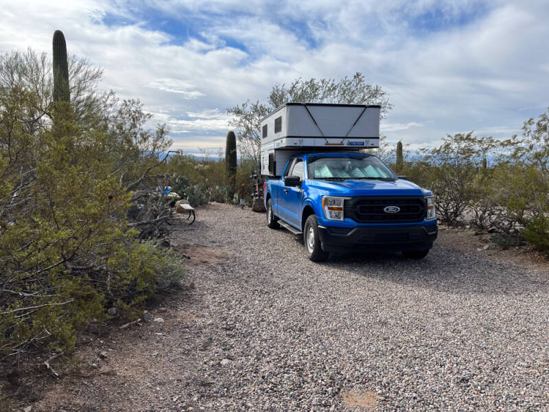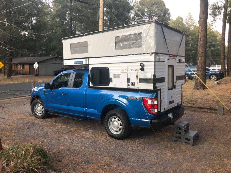 Coyote Hawk began her adventurous life in our driveway, plugged in, with an electric heater going, on December 1, 2021. That was our first night in her. We had no idea what we were doing and weren't sure we'd survive it...lol. The house was close in case we forgot anything or got too cold. We slept in down sleeping bags and made coffee and tea in the morning, just for practice. We've come a long way.